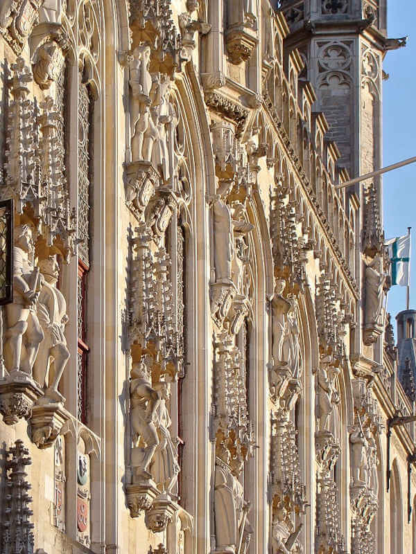 Depuis l’extérieur, c’est la façade qui impressionne le plus. La travée avec ses nombreuses niches entourant chacune des fenêtres est souvent pointé du doigt même si cette construction n’est pas inédite. La façade est surmontée de 3 tourelles en encorbellement et le toit est parachevé par de petites lucarnes et autres décorations. Les fenêtres sont décorés avec les armoiries des Francs, c’est à dire les vassaux de la cité. Il y avait 48 statues qui ornaient cette façade dont certaines étaient peintes par le maître Jan Van Eick. Elles ont disparu à la Révolution.
